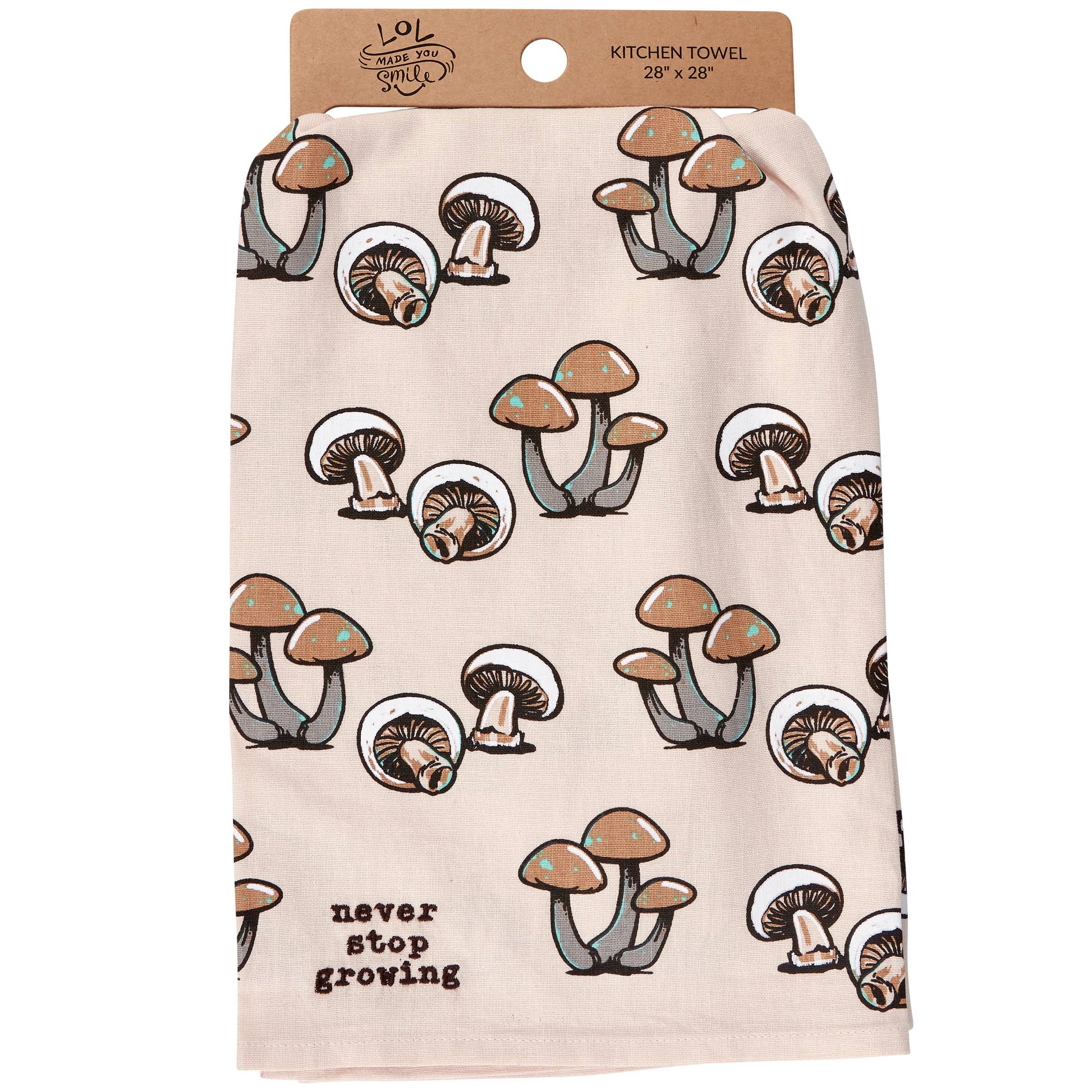 A cotton-linen blend kitchen towel from our Homestead Collection displaying an all-over design of mushrooms with an embroidered sentiment that reads "Never Stop Growing." Our Never Stop kitchen towel is conveniently machine-washable for easy cleaning. Packaged on a cardboard hanger with hole to easily display on rack. A homestead-themed kitchen accessory perfect for everyday use.