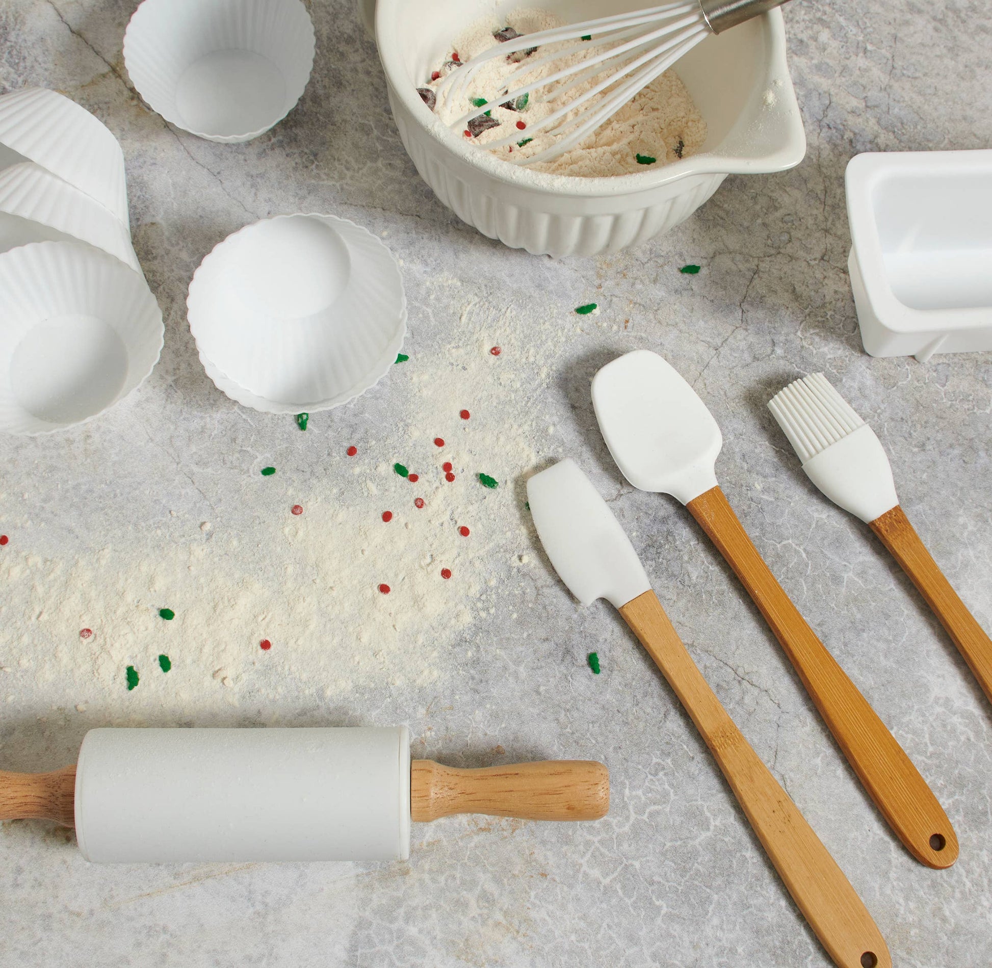 A baking set from our Christmas Collection featuring kid size baking items perfect for gifting or getting kids excited for holiday baking. Baking set holds 12 pieces including 6 silicone baking cups, 1 silicone bread mold, 1 whisk, as well as a silicone rolling pin, pastry brush, spatula, and spoon all with wooden handles. Hand-wash recommended; do not microwave. Our Kid's First Baking Set comes packaged in a cardboard box with each item secured and displayed in acrylic window for easy shelf display and gifting. A fun set of baking accessories perfect for the holidays and year round. Recommended for ages 6+.