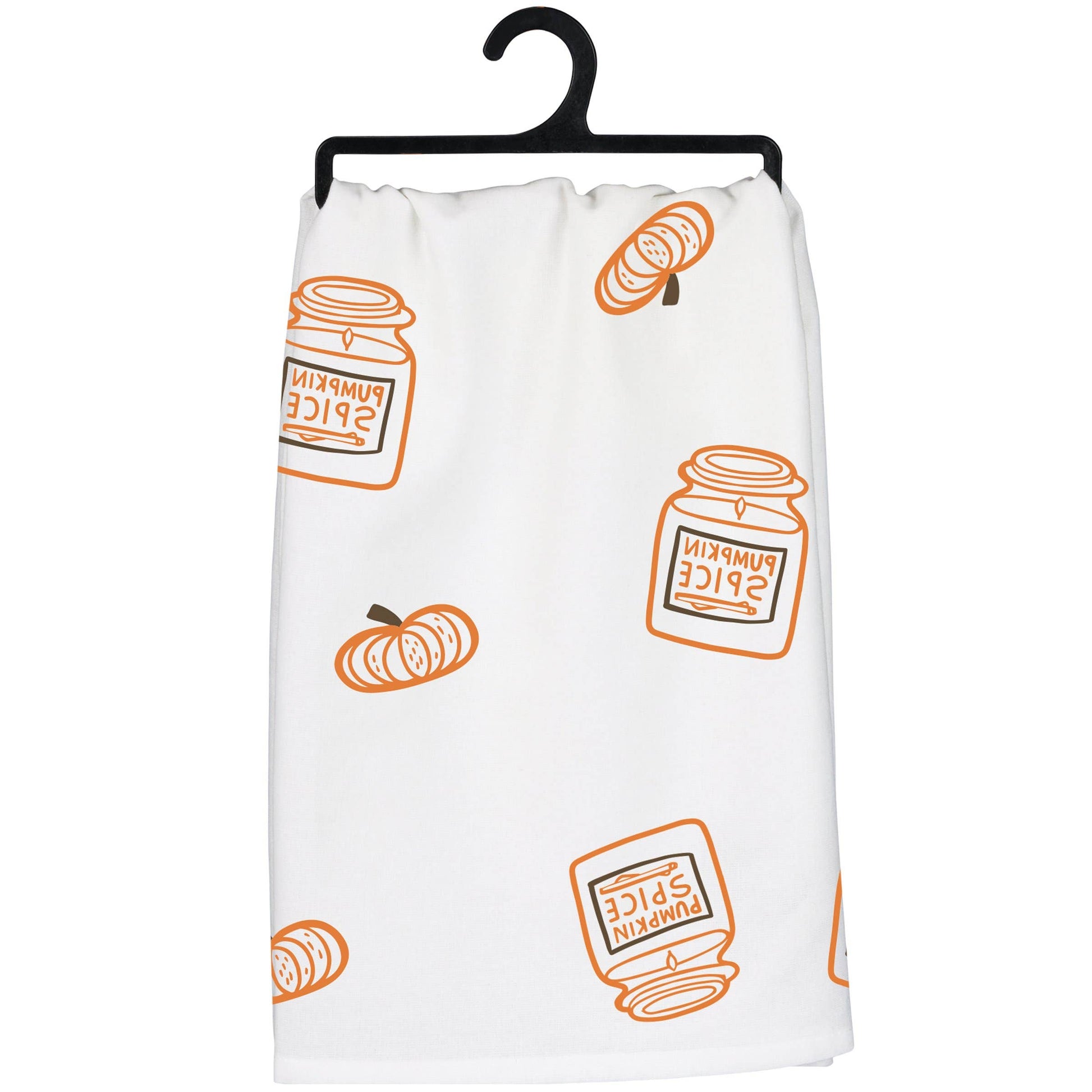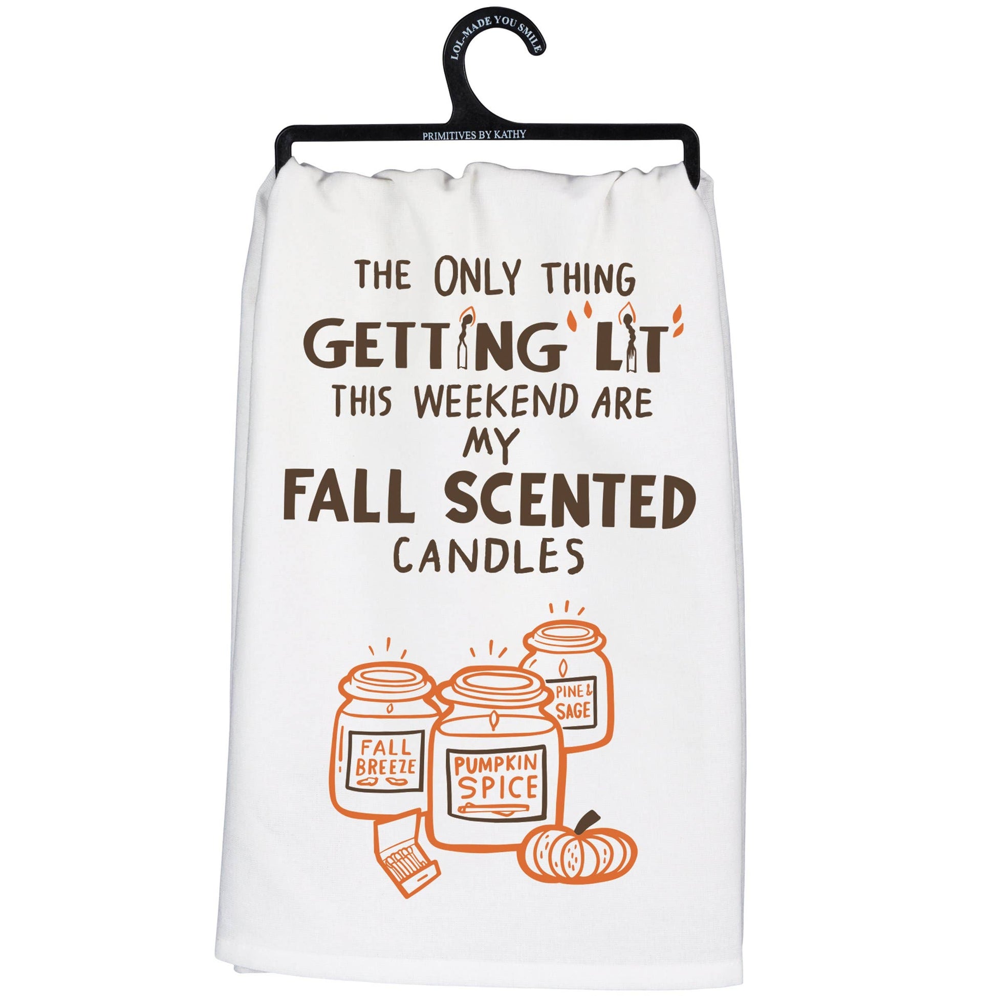 Complementary to a variety of kitchen decor styles, a cotton kitchen towel featuring a "The Only Thing Getting Lit This Weekend Are My Fall Scented Candles" sentiment with pumpkin spice candle and pumpkin designs throughout. Machine-washable.