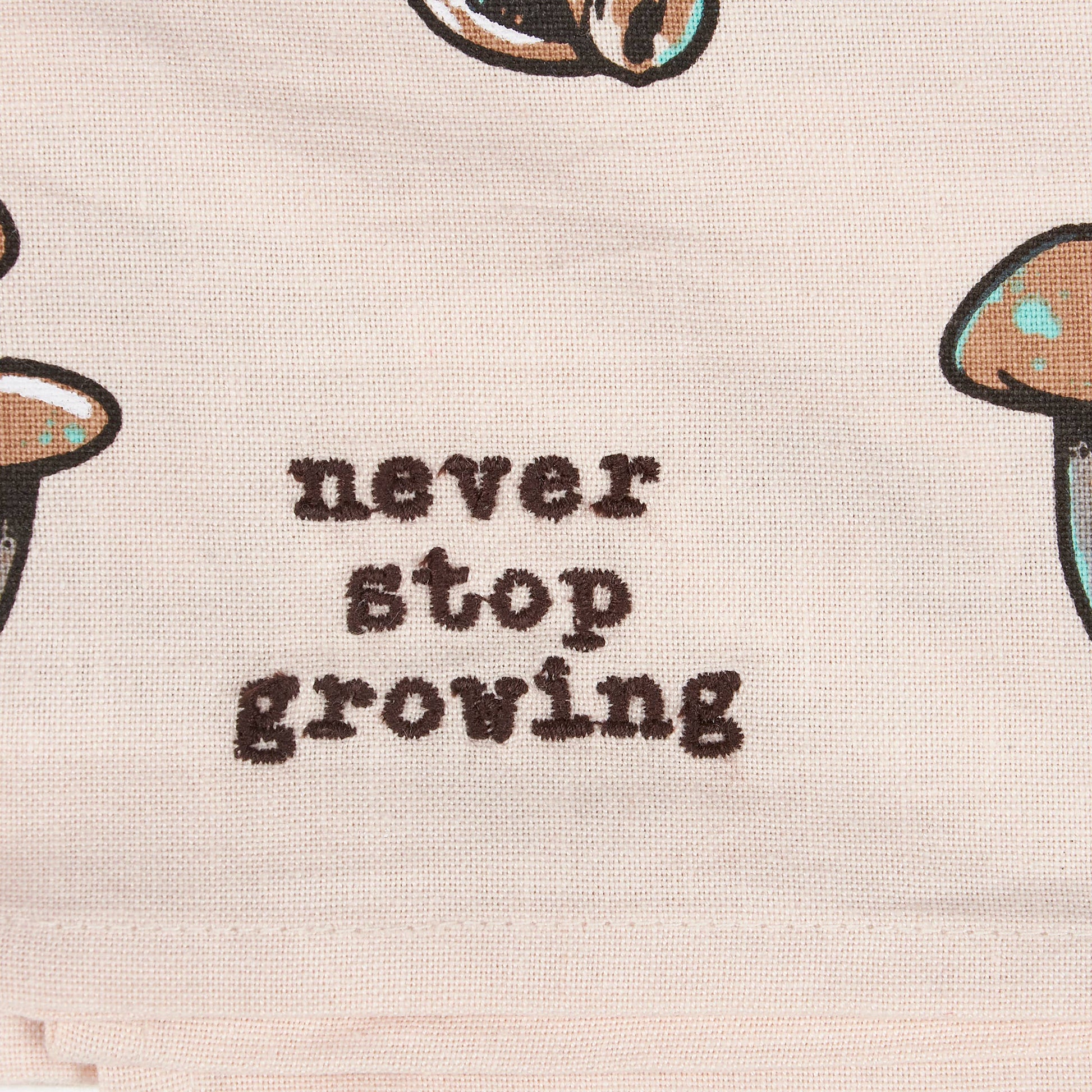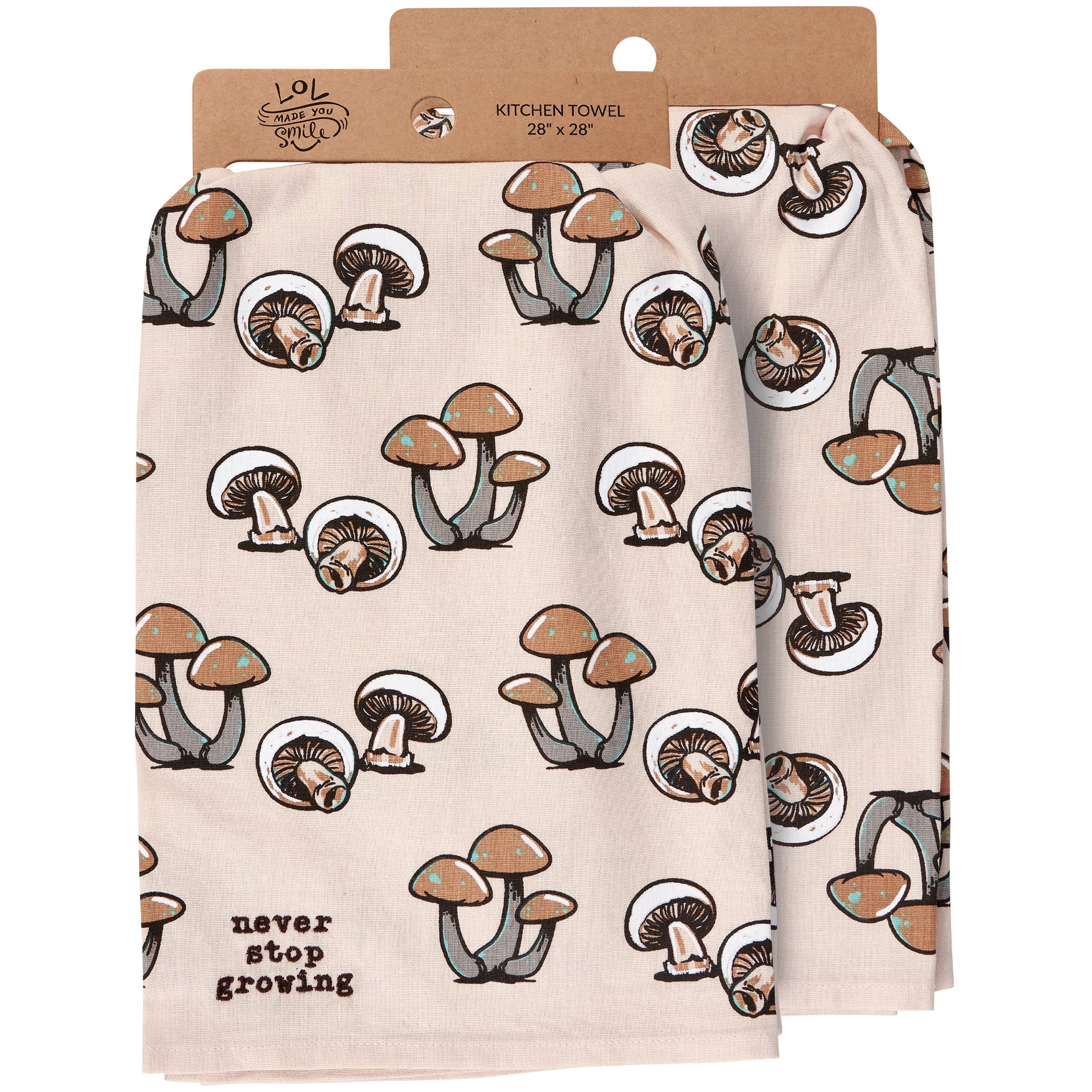 A cotton-linen blend kitchen towel from our Homestead Collection displaying an all-over design of mushrooms with an embroidered sentiment that reads "Never Stop Growing." Our Never Stop kitchen towel is conveniently machine-washable for easy cleaning. Packaged on a cardboard hanger with hole to easily display on rack. A homestead-themed kitchen accessory perfect for everyday use.